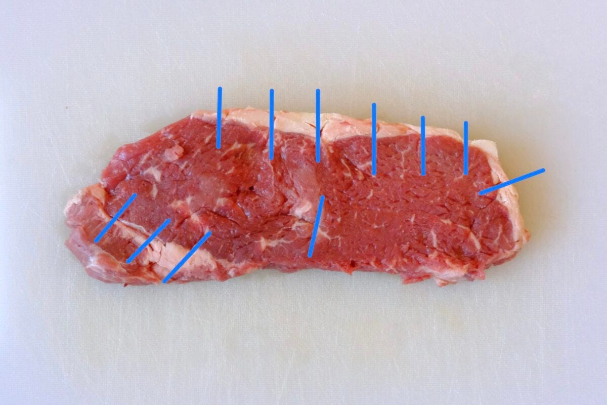 脂身と赤身の境目にある筋を表裏ともに大体2cm間隔で切っていきます。こうすることで、焼いた際に肉が縮むのを防げるそう。