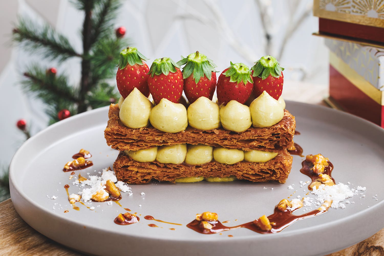 今冬は、イチゴやピスタチオといったクリスマスにふさわしい彩り豊かな食材を使用したスイーツが期間限定で登場。人気の「季節のミルフィーユ」は、昨年も好評だったイチゴ&ピスタチオクリームのクリスマスバージョン。フワッと口溶けの良いクリームと特徴で、華やかなホリデーシーズンにぴったりな一皿。