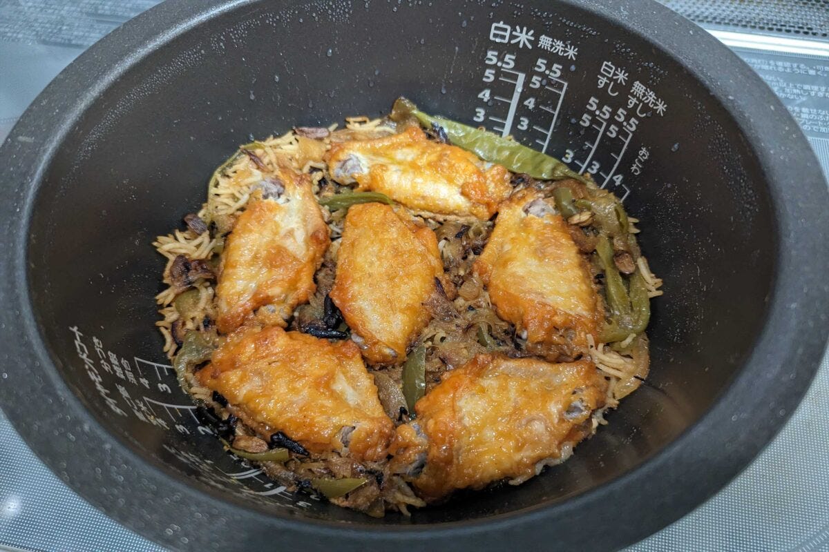 あとは普通に炊き込めば辛味チキンビリヤニの完成。今回は冷蔵庫にピーマンが余っていたので一緒に入れたが、同様にお好みの野菜を入れても良いだろう。