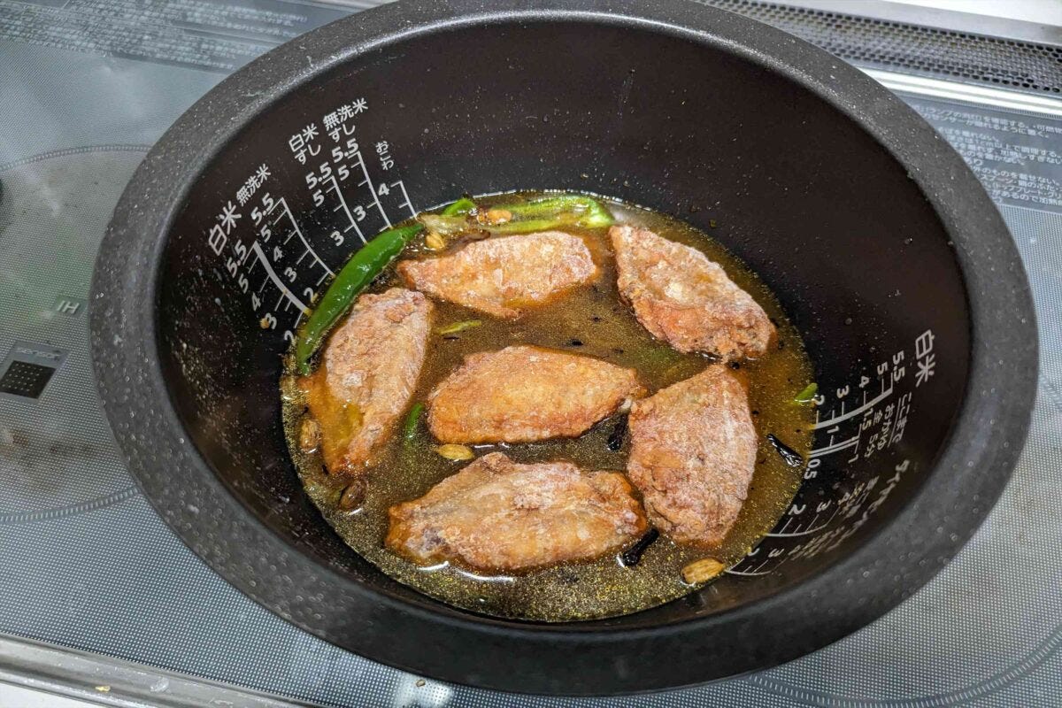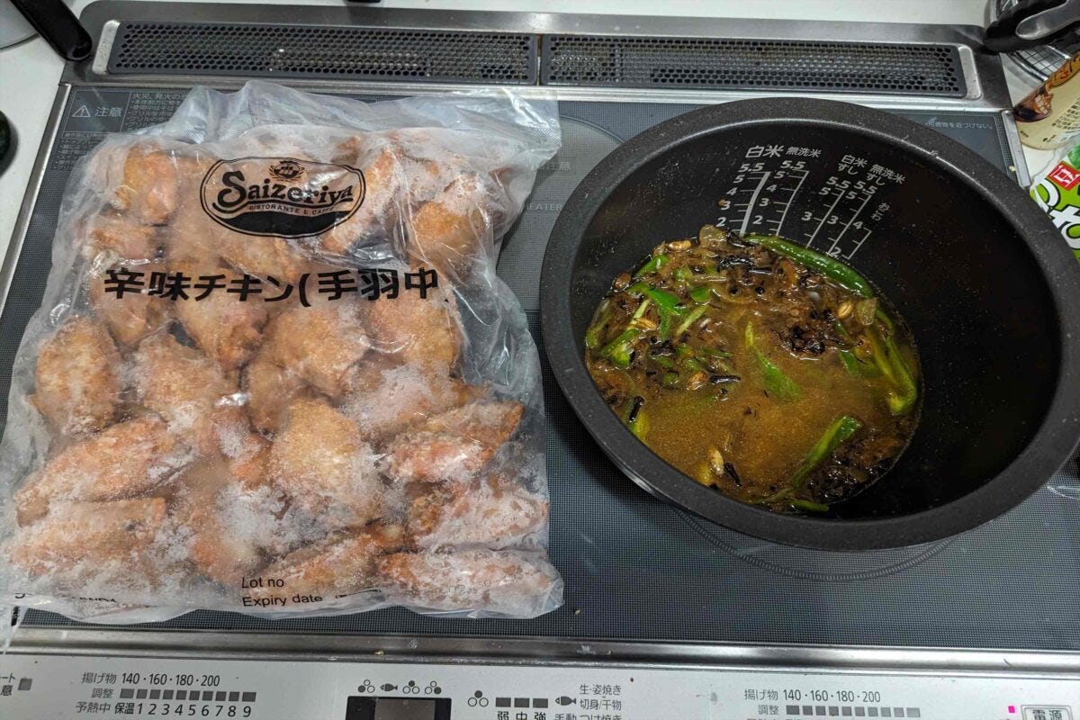 米1合分の水に固形コンソメ1つを溶かし、先ほどのスパイスフライドオニオンとともに炊飯器に入れたバスマティライスに注いで辛味チキンを好きな数のせよう。