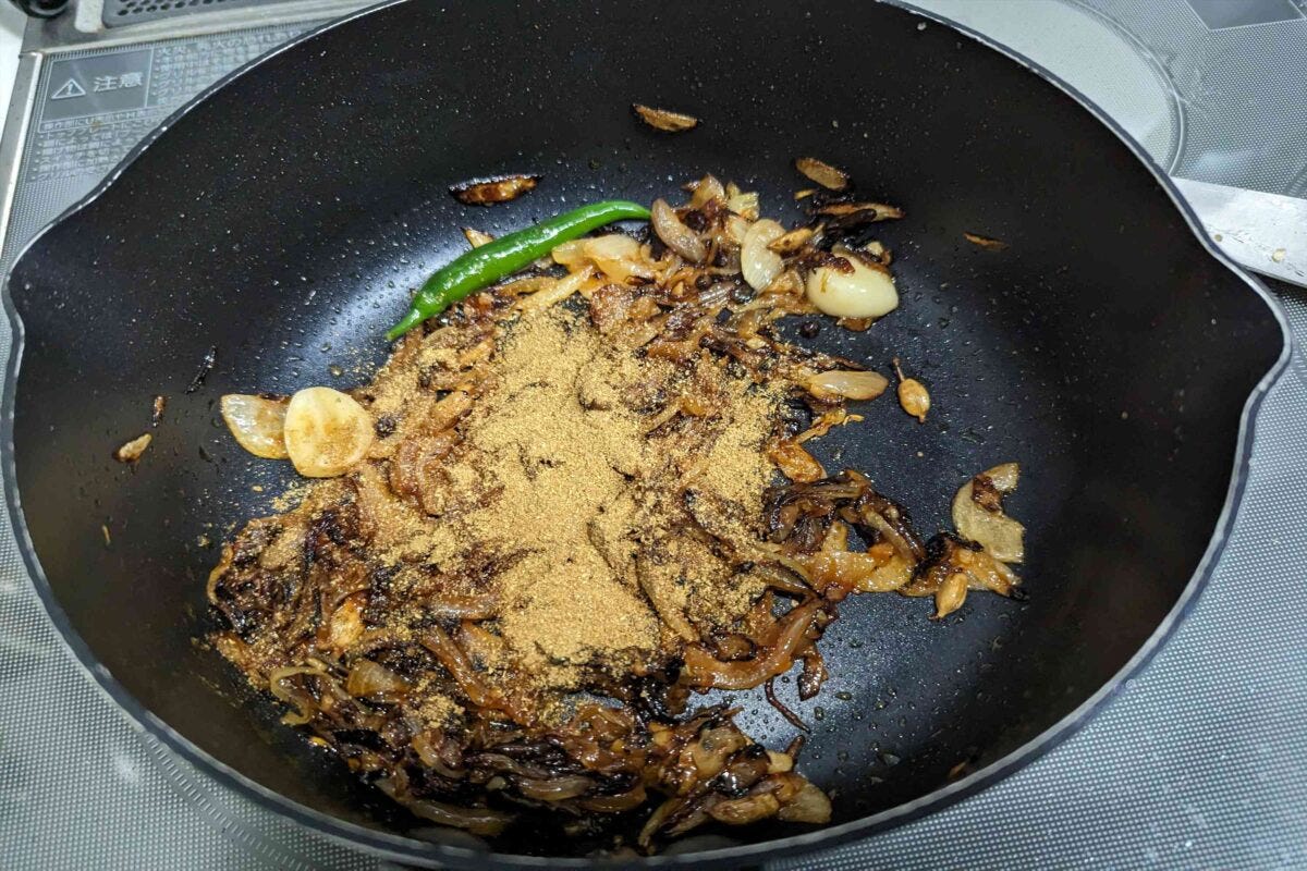 炒め終わったら一度火を止めてコリアンダーパウダー大さじ3、ガラムマサラ小さじ1、にんにくとしょうがすりおろしを大さじ1杯ずつ、トマトケチャップを大さじ1、あれば青唐辛子を1本入れて香りが出るまでさらに炒める。