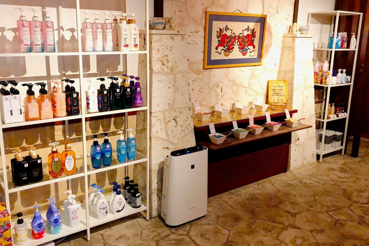 ロビー中央に設けられたシャンプーバーと入浴剤バイキングには、人気のシャンプーやコンディショナー、ボディソープ以外にもクレンジング剤や洗顔料、沖縄のスパ『Ryu Spa』のアイテムも揃っています。