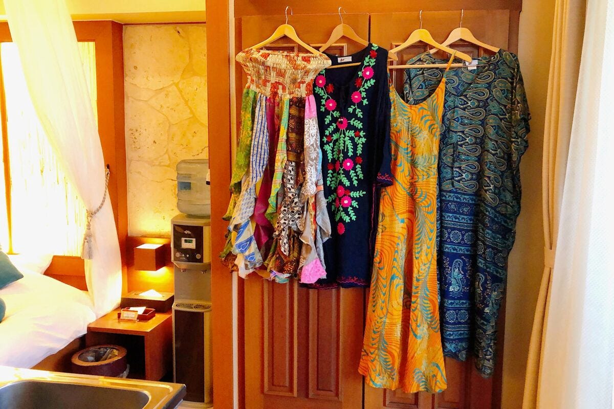ウェア類のレンタルはメンバー2着目以降550円。写真のようなリゾートワンピ以外にもジェラピケなどの可愛いルームウェアもあります。