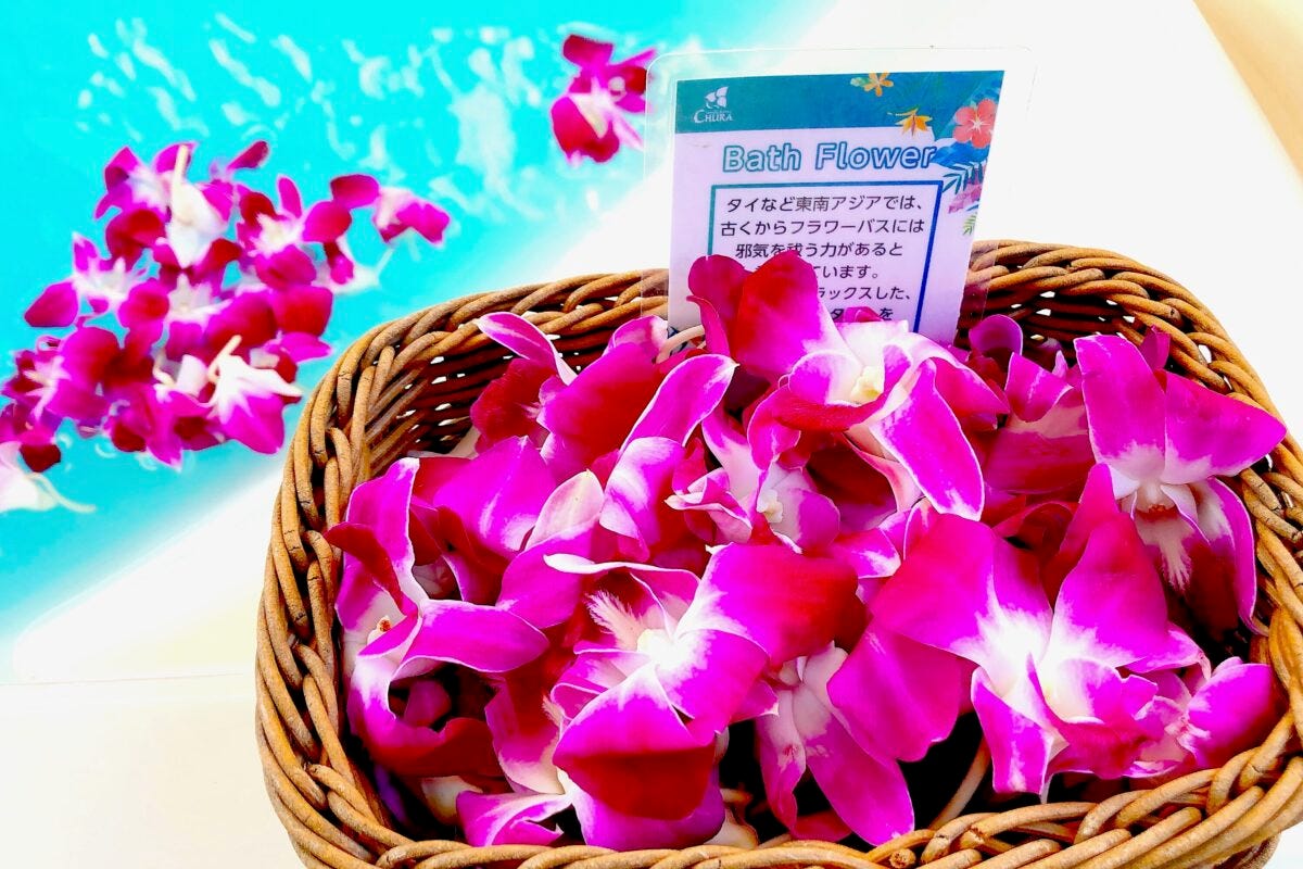 広々とした露天風呂にはL字型のソファーやハンギングチェア、テレビなどもあり、とっても開放的! 全室で人工温泉が楽しめます。406号室ではフラワーバス用のデンファレが無料サービス。1バスケット500円で追加も可能です。