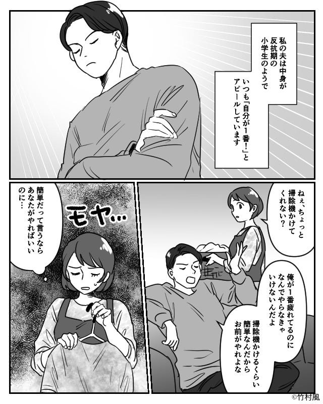 家事を頼んでも「俺が一番疲れてる」「簡単なんだからお前がやれ」と、主人公に押しつける夫…。