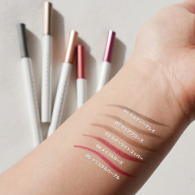 上からスモーキーな抜け感のミスティーグレイ、絶妙なニュアンスブラウンのセピアブロンズ、目元で柔らかくきらめくスターライトコッパー、色気と血色感を引き出すメイプルローズ、透明感を引き立てるクリスタルパープル。
