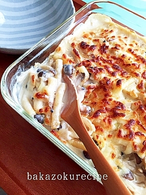 グラタンとは...。好きな具材を炒め、ホワイトソースと一緒に型に入れて、チーズを乗せて焼けば良いのです。