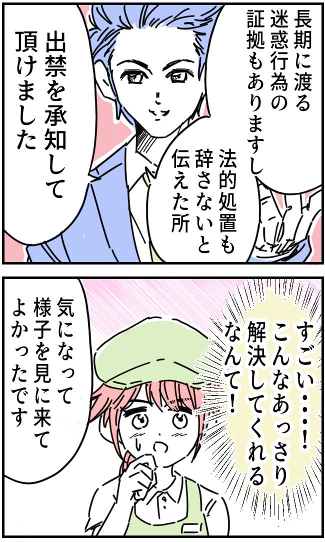 悪いのは迷惑客なのに謝罪をしてくれるマネージャーは立派な人だと思いました。 無事に出禁になってよかったですね。 (30代/女性)主人公が悩んでいるところ、マネージャーが助けてくれてよかったです。 迷惑客には困りますが、頼りになる上司がいるといいですね。 (20代/女性)※本文中の画像は投稿主様より掲載許諾をいただいています。
