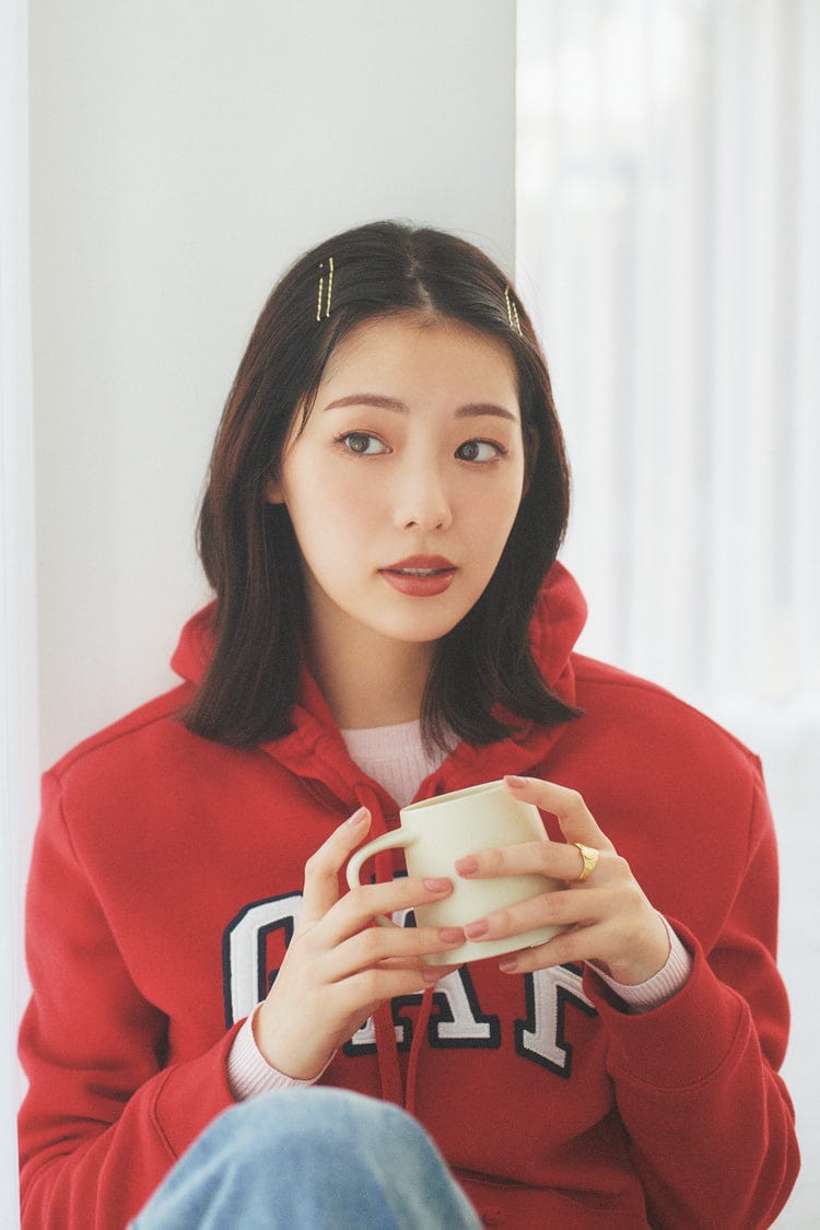 レッドロゴパーカ 5,990円/Gap リブニットトップス 8,980円/épine デニムパンツ 14,300円/ACYM リング 11,000円/チビ・ジュエルズ(チビジュエルズ・ジャパン) ヘアピン/ヘア&メイク私物 撮影/女鹿成二 スタイリング/杉本奈穂(KIND) へア&メイク/サイオチアキ(Lila) モデル/中村里帆 文/柿沼奈々子