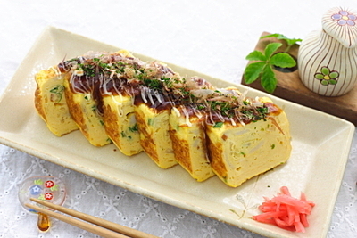 キャベツ入り卵焼きにおたふくソース、かつお節、青のりをトッピングすれば、、、あの味に〇