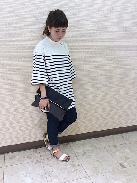 ボトムスがぴったりめな分、トップスはゆるっと着てバランスを。