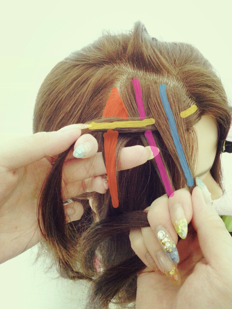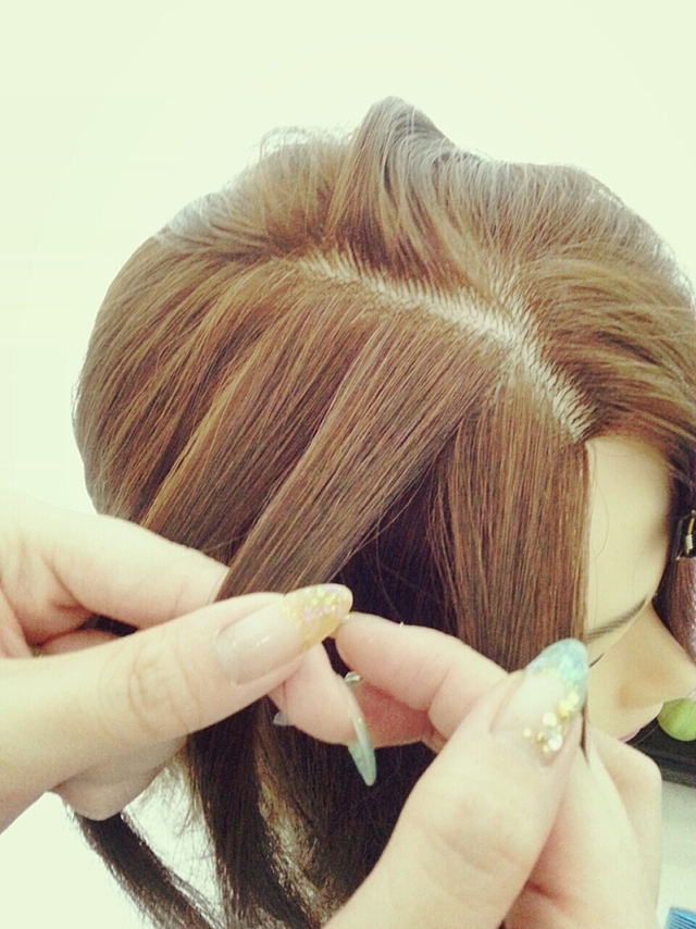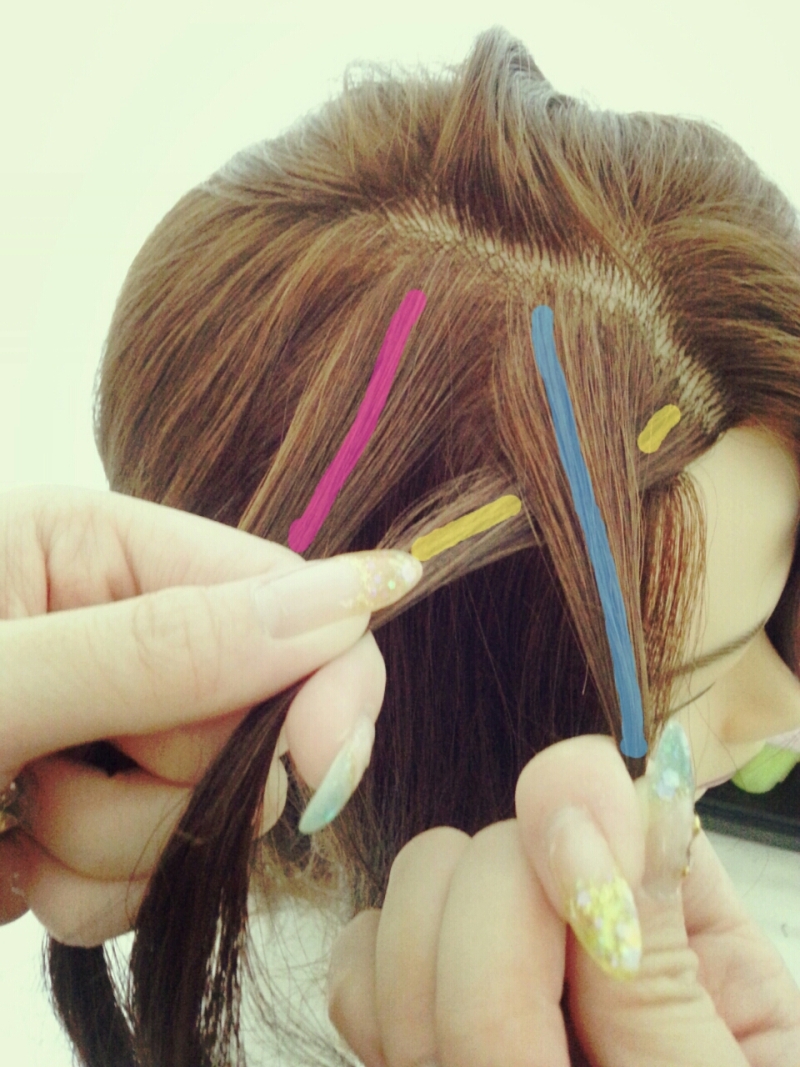 すくう位置は、右手で持っている毛束のすぐ下の位置です。