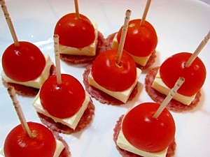 サラミは薄くて、ピックから落ちやすいので、トマトとチーズの間にさすのが良さそう!