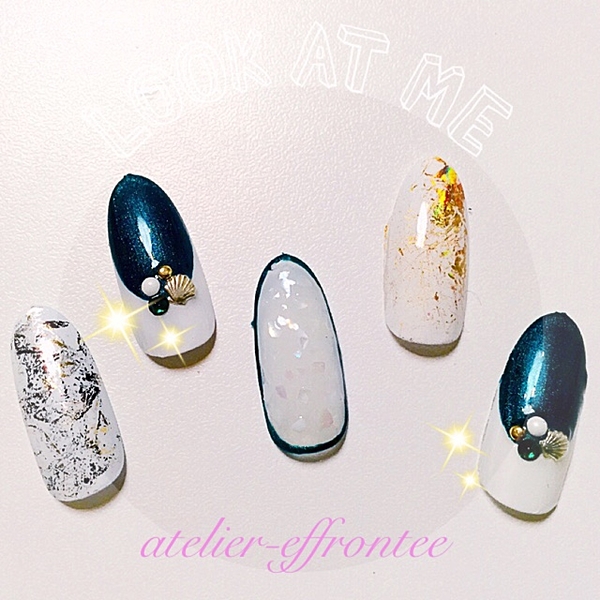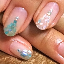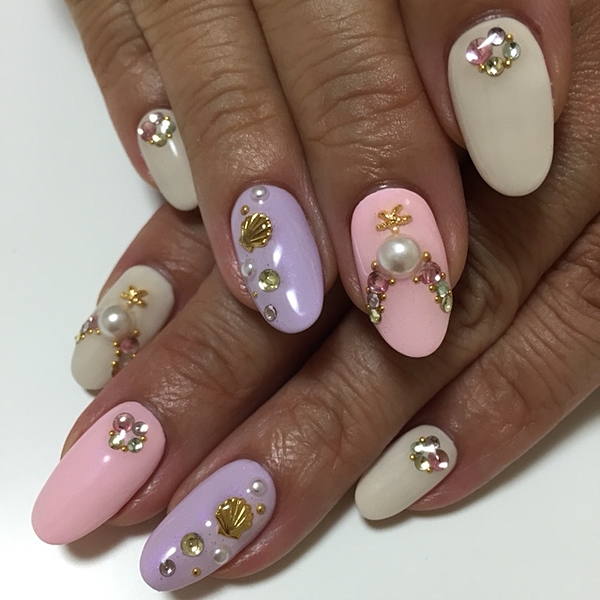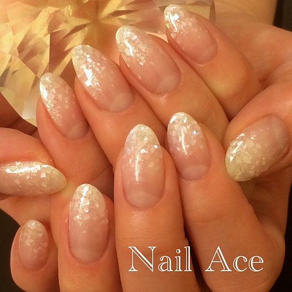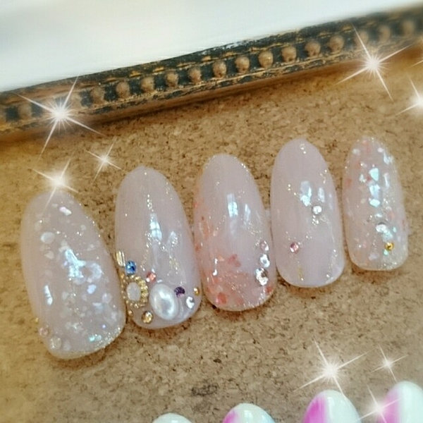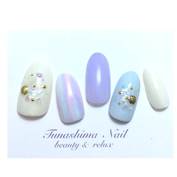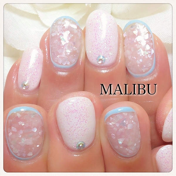 白やクリアのベースにホワイトやオーロラのシェルを使って。シンプルで透明感のあるデザインです。