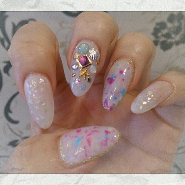 シェルにも色んな色がありますが、色んな色をミックスしたマルチカラー使ったフレンチネイル。ベースカラーがシンプルでもマルチカラーなら存在感タップリ。