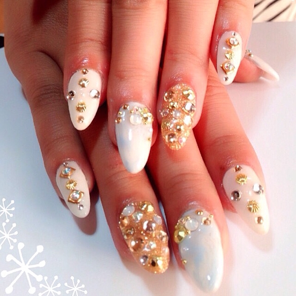 白ベースにゴールドのストーンやパーツをたっぷり使ったデザイン。ヴィンテージでラグジュアリーな輝きです。