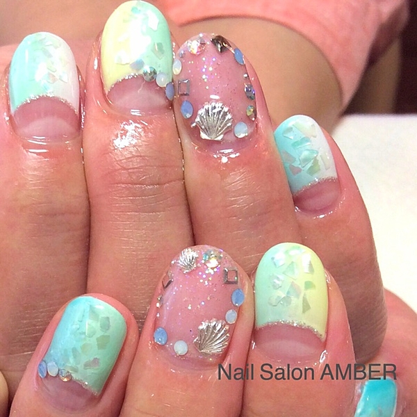 ミントとイエローの夏カラーの縦グラデーションが南国風で素敵!クリアべースにストーンとシェルの囲みラインのデザインは流行していますね。