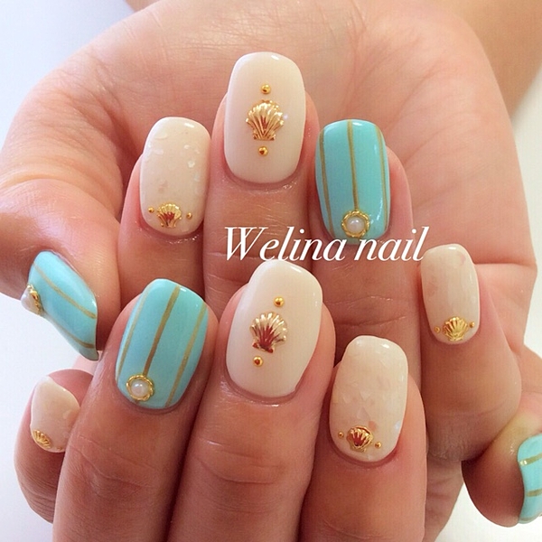 夏っぽいボーダー×シェルネイル。シェル特有の柔らかい輝きがさりげなくゴージャスに。