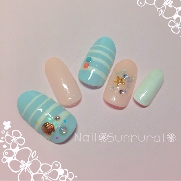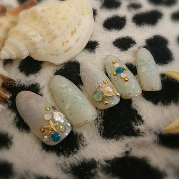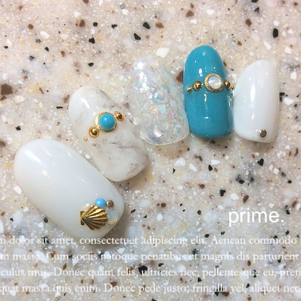 1本だけアクセントにストーンやシェルパーツを配置。ホワイトオパールやミントアラバスタ―のストーンは海ネイルと相性のいいカラーです。