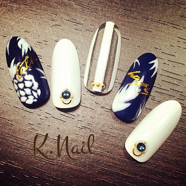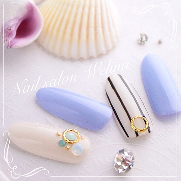 ホワイトの1色塗りをベースに、ターコイズブルーのストーンとメタリックパーツがオシャレ♪