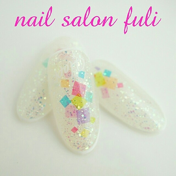 ホワイトベースにブルーやピンク、パープルやグリーンのカラフルホロが入ったネイルポリッシュ