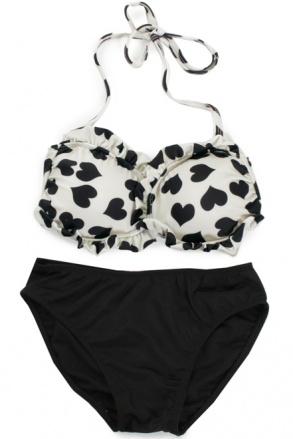 ビキニはフリルとハート柄が特徴的。デザインはラブリーですが、使っているカラーはホワイトとブラックのみなので、甘すぎない仕上がりになっています。ボトムがシンプルなのも大人っぽいですね。