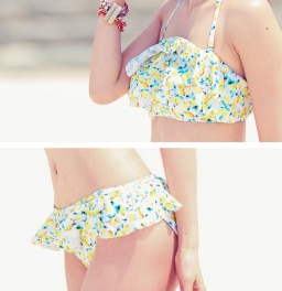 柔らかなレモンプリントデザインのビキニ。ホワイトカラーが多めの配色なのでとってもガーリーです。胸元の大きなフリルがバストにボリューム感を出してくれるのも嬉しいです!