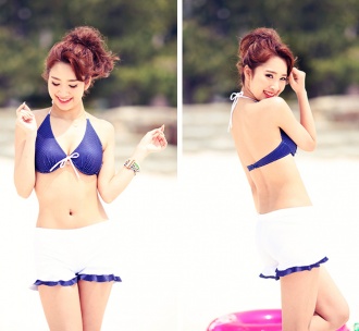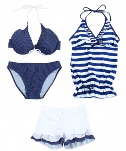 青地に小さなドット柄のシンプルな水着。中央の白いリボンがよく目立ちます。ボーダーのキャミとショーパンがセットになっていて、アレンジを楽しめるセットビキニなんです。
