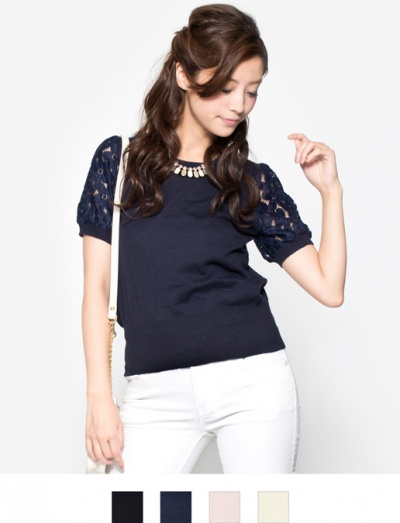 袖のレースのデザインがガーリーで涼し気なサマーニットは、シンプルながらも存在感のある1着。