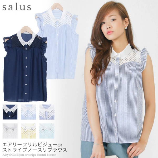 肩のフリルがキュートなノースリーブブラウス。透け感のある素材が清潔感を出していますね。首元のレースからはかすかに肌が見えるので、涼しげで良いです!