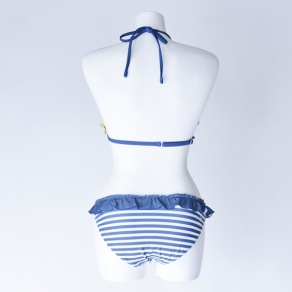 中央はドット柄の生地にフラワーモチーフがつけられたホルタービキニ。胸元だけじゃなくセットのスカートにもお花がついていて可愛らしさ満点です。
