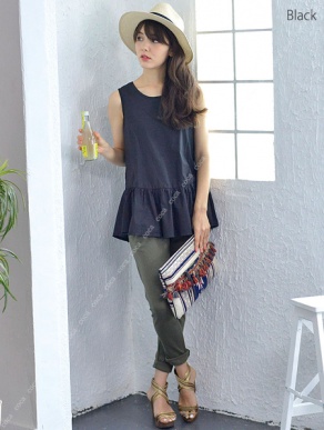 写真右はサラッとしたかなり薄めのコットン素材でこれからの暑い季節にオススメのトップス。正面からのデザインは一見シンプルですが、裾と後ろのレースでバックスタイルはセクシーに仕上がります。一着で異なる印象を与えてくれる万能アイテムです。