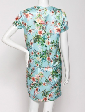 左は光沢感のある生地に大きくフラワーがプリントされたワンピース。インパクト大ですね。花柄だと甘くなってしまうものですが、トロピカルな雰囲気のある柄のため、大人キュートにまとまっています。