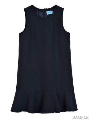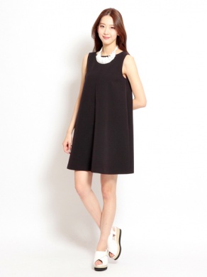 中央はローウエストからフレアに広がるノースリーブワンピース。ネックラインにはタックがアクセントとして置かれ、よりスタイリッシュな印象を与えています。すそがフィッシュテールになっているのもポイントですね。