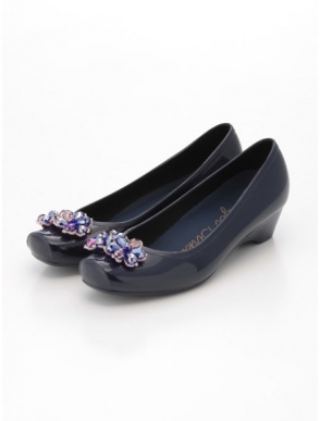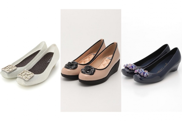 右はキラキラとしたフラワーモチーフが印象的なレインパンプス。きらめく足元を見れば憂鬱な気分も吹き飛んじゃいますよ。雨の日には歩きやすい、程よいヒールの高さもポイントです。