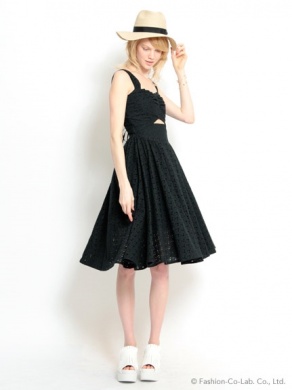 左は上半身の花柄レースが最高にキュートなレースドッキングフレアワンピース。ワンカラーでまとめてあるので子供っぽさはなく、大人女子でも着こなせますよ。ボトムラインがフレアな作りになっているので、脚も細く見えますね。