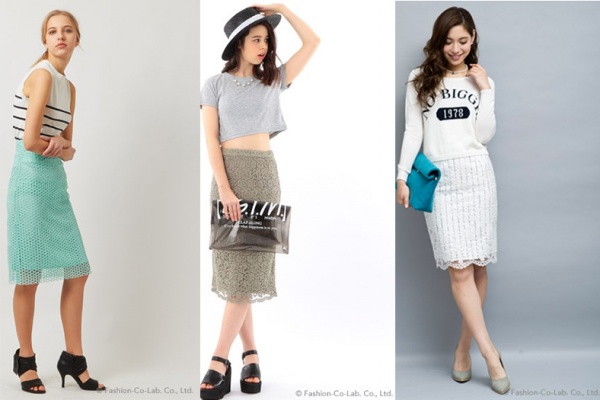 左はペパーミントカラーが爽やかな印象のレースタイトスカート。昨年に引き続き流行中のアイレットレースを贅沢に使用していて、小さな花柄が可愛らしいですね。