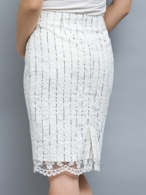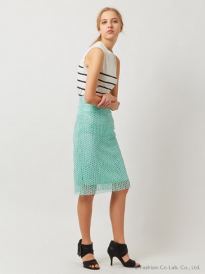 右の1枚は一見男性的なストライプ柄の生地にレースを重ねた遊び心あるタイトスカート。そのため、トップスはカジュアルでも、フェミニンにも合わせることが出来ます。大き目のレース模様が軽やかに女っぽさを演出していますね。