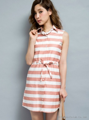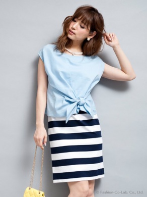 ◆ドッキングワンピで着痩せ効果もシャツとボーダースカートをコーディネートしたようなドッキングワンピ。ウエストで絞ったリボンが目線を上に持って行くのでスタイルアップ効果も得られます。