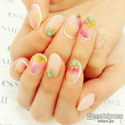 ピンク×オレンジのタイダイ柄とターコイズを合わせれば、一気にテンションが上がるポップな夏デザインの完成です。
