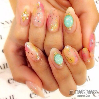 ターコイズやピンクのストーン、ゴールドのチャームなどをミックスさせて大人キュートな仕上がりに。