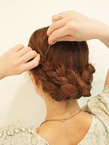 サイドの三つ編みを交差するようにしてピンで固定。