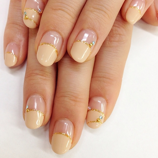 ミルクティーみたいなヌーディーカラーに、ダークブラウンで極細フレンチ