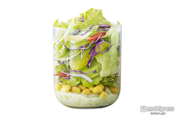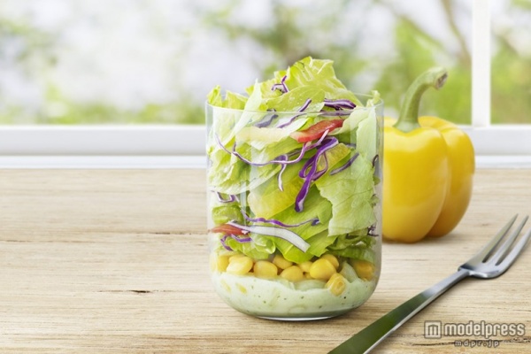 そして、「サイドサラダ バジルソース」は、シャキシャキレタス、紫キャベツ、パプリカやスイートコーンなどの野菜に、香り高いバジルを使用したクリーミーな味わいが特徴のパスタサラダを組み合わせ、ジャーサラダスタイルで楽しめる。ドレッシングは既存の「焙煎ごまドレッシング」と新ドレッシング「低カロリー玉ねぎ」から1つ選べる。