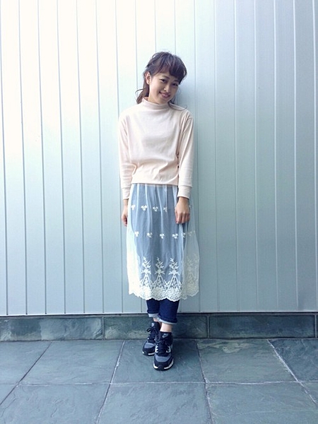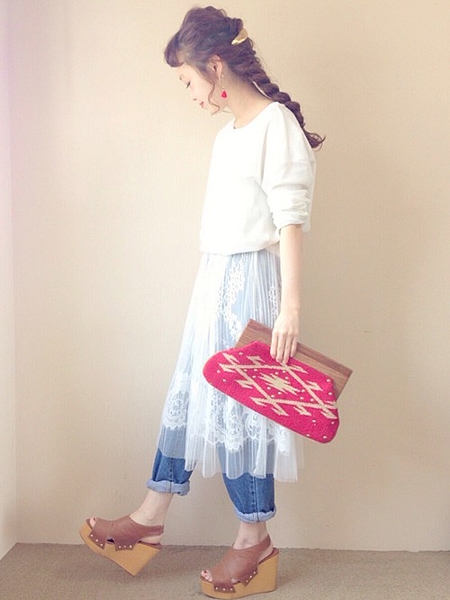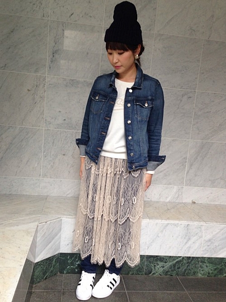 デニムにレーススカートを重ねてオシャレ上級者に
