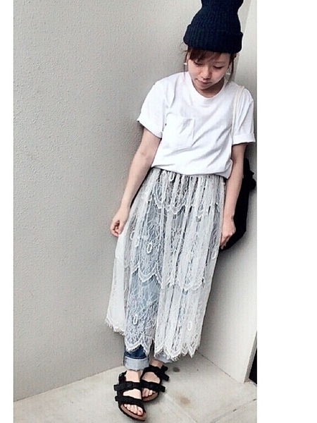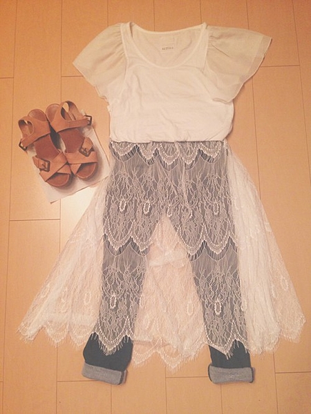 Tシャツにデニム。これだけだったらカジュアルすぎるけど、レーススカートを合わせてレディアップさせて♡