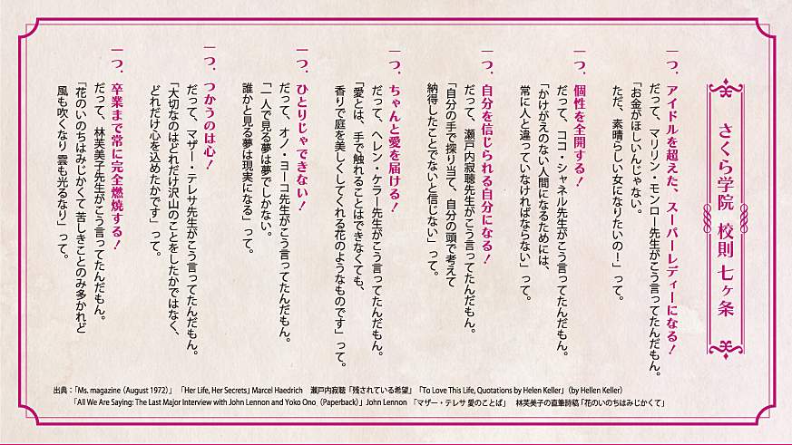 マリリン・モンローやココ・シャネルといった偉大な「スーパーレディ」の名言を取り入れた校則を守りながら、アイドルのその先を目指しています。