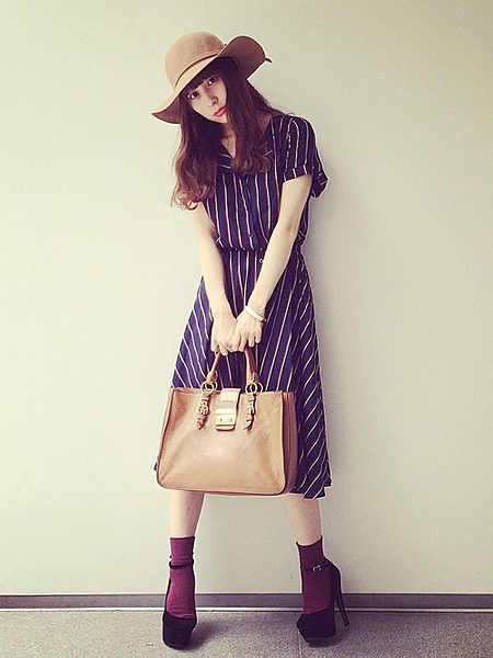 レトロなコーディネートが素敵なファッション。バッグと帽子の色を合わせてまとまりを。