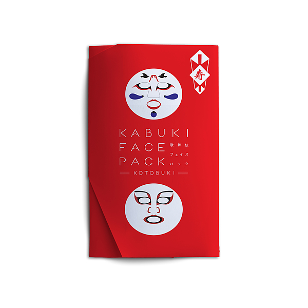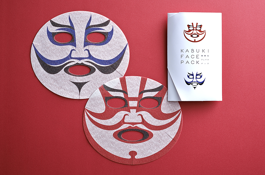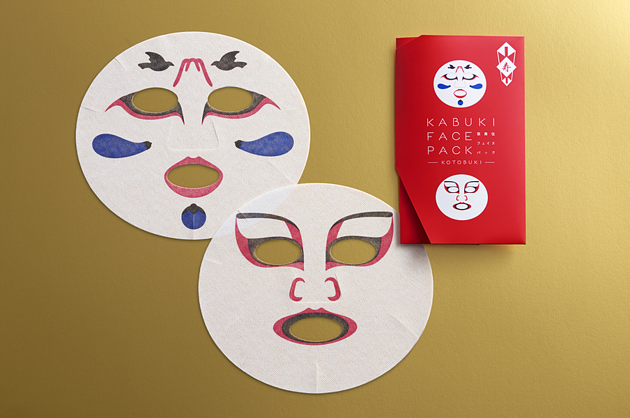 今回は、歌舞伎のおめでたい演目として正月公演で度々上演されている「寿ことぶき曽我 そがの対面たいめん」と「操り三番叟さんばそう」から、父の仇を打つ曽我五郎(そがごろう)の「むきみ隈」と、祝いに踊る三番叟の「戯れ隈(ざれくま)」をフェイ スパックにしました。この「戯れ隈」は、市川染五郎氏が考案した、「一富士二鷹三茄子」を取り入れた縁起のいい隈取になっており、顔 につけると幸せになれるフェイスパックとなっています。