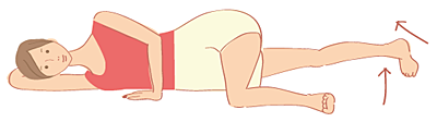 姿勢が取れたら、お腹の中の息を吐き出しながら下になっているほうの脚(右の腕や脚が下になるように横になっていたら右脚)を持ち上げていきます。